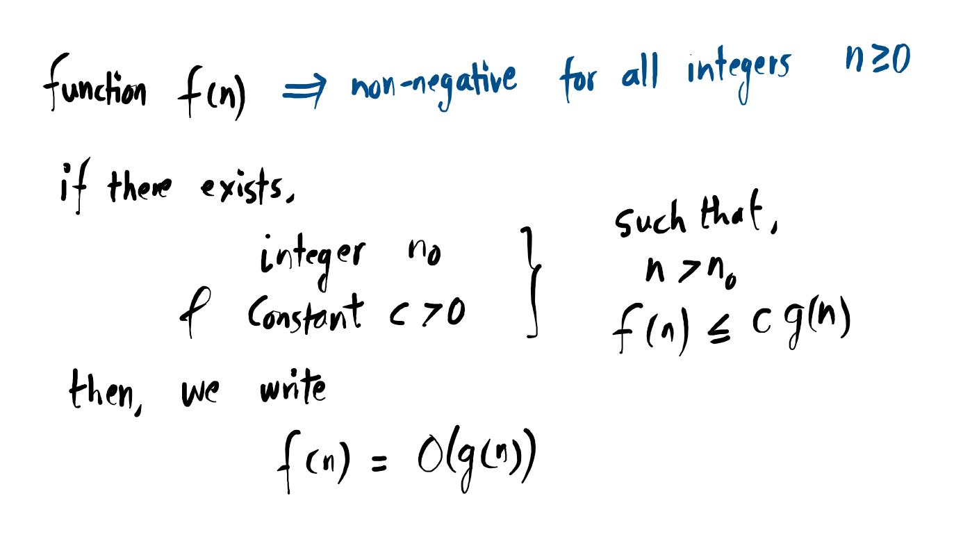 Note: This confirms that \( g(n) \) is an upper bound for \( f(n) \). Beyond the point \( n_0 \), the algorithm will never perform worse than the scaled complexity function.