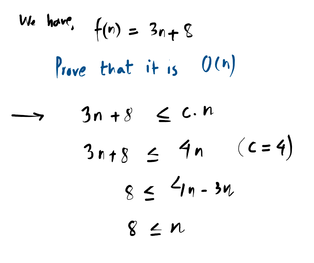 Since the inequality holds whenever n ≥ 8, we can confirm that f(n) = O(n) using c = 4 and n₀ = 8.