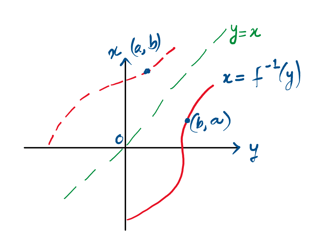 - If the point $(a,b)$ is on the graph of $f$, then the point $(b,a)$ is on the graph of $f^{−1}$.