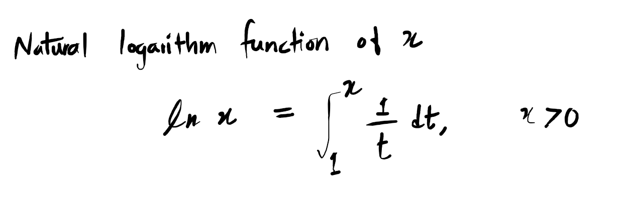 This definition is crucial because it links the logarithm directly to integration, showing that the derivative of $ln(x)$ is $\frac{1}{x}$.