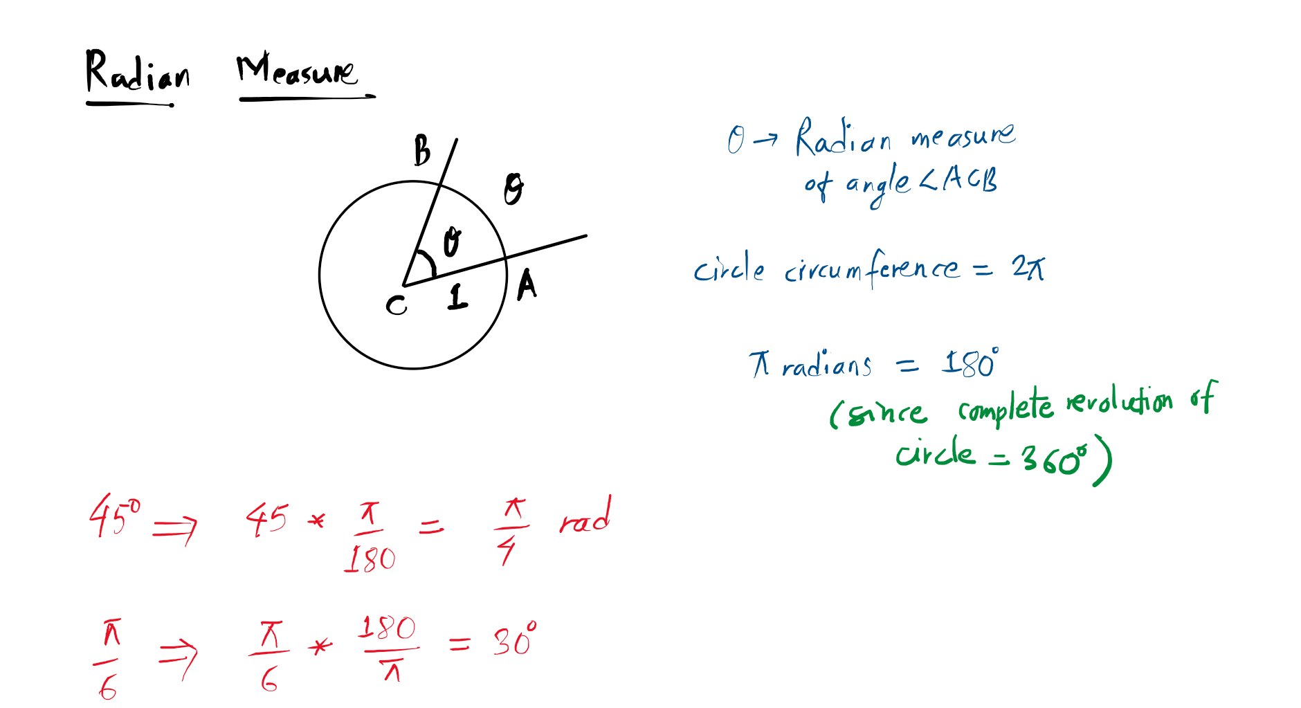 Radian is a unit of measurment. In calculus, angle is measured in radian. (Navigation and astronomy uses degrees for angles) – page 35