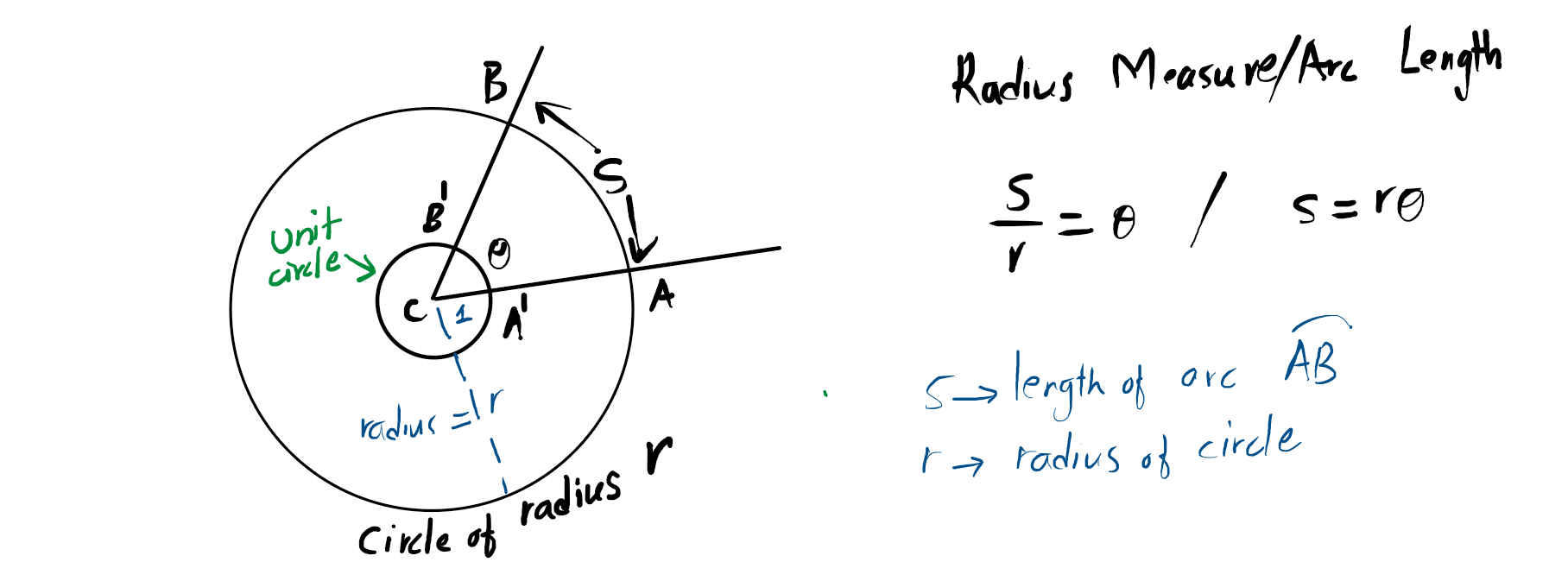 Radian measure $\theta$ is given by $\frac{s}{r}$ wher $s$ is arc length AB and $r$ is the radius.