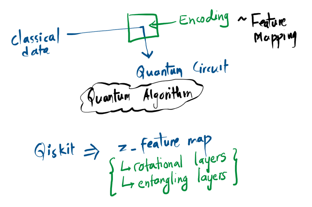 For classical data to be used by quantum circuit, it needs to be encoded which is called data encoding. In qiskit, we can use tools like z_feature_map or zz_feature_map etc. which includes rotation layers and entangling layers.