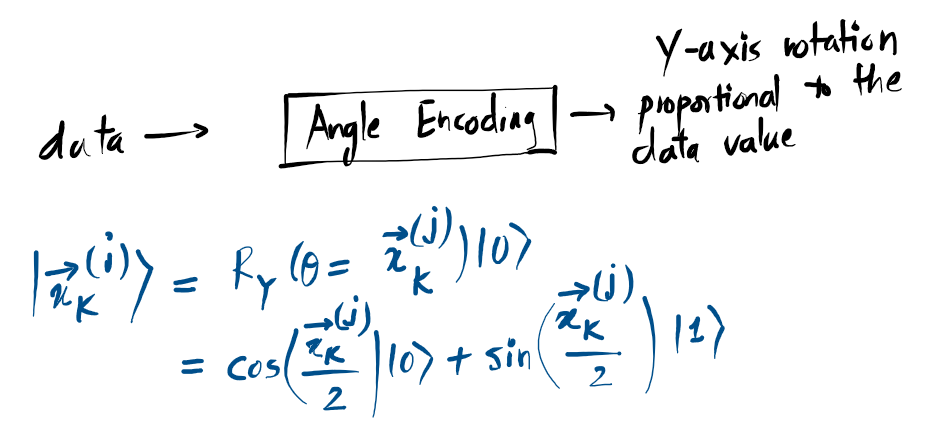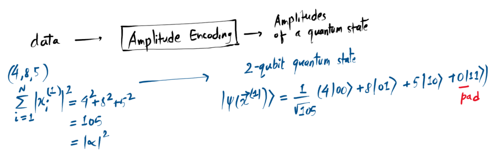 • Amplitude Encoding: The data vector elements are scaled so their squares sum to 1 (\( |\vec{x}^{(j)}| = 1 \)).