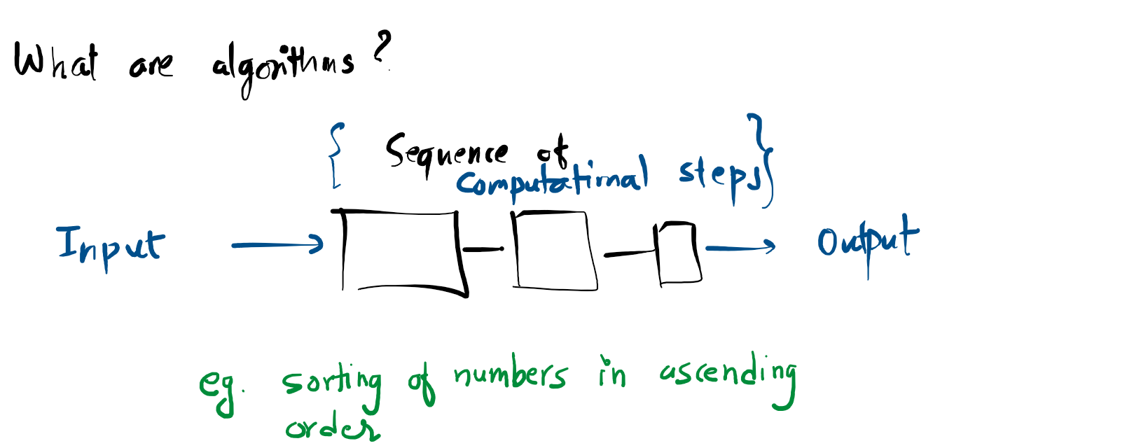 An algorithm is like an recipe. With input, we have ingredients such as data in numbers, text or lists etc. We follow a sequence of well defined operations on that data such as cooking instructions (Process). Through those processes, we get output (the meal) like sorted list, specific value or yes/no etc.