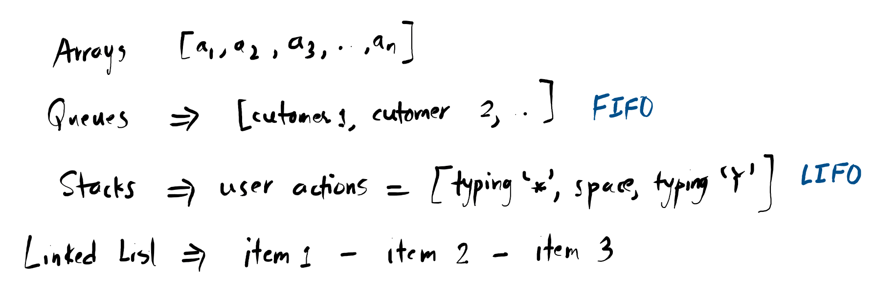 - Stacks: LIFO (Last In, First Out). Think of a stack of plates.