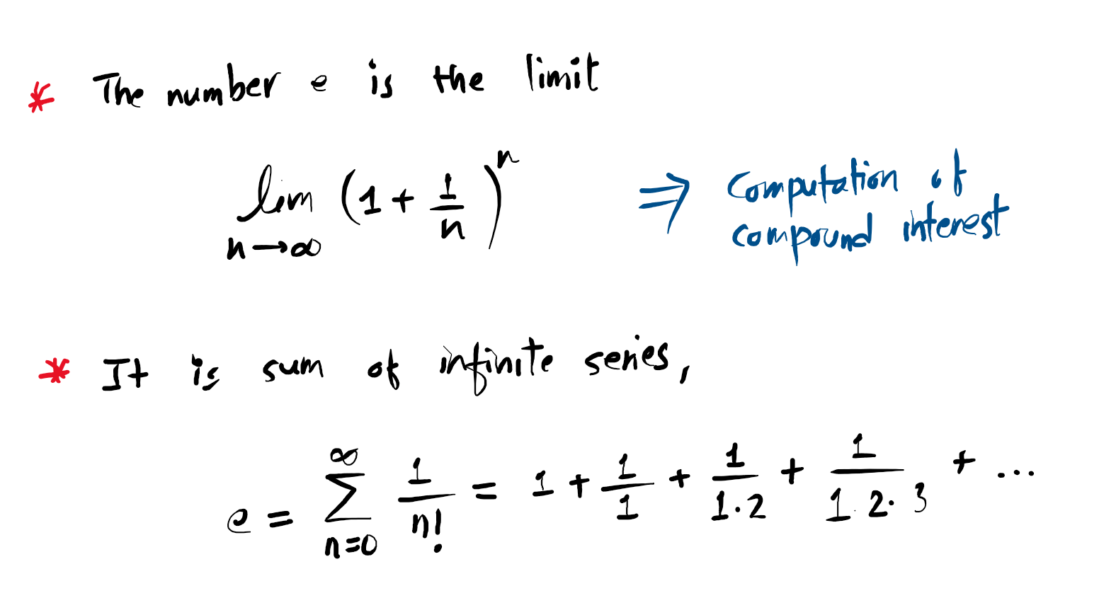 It can also be expressed as the infinite sum \[ e = \sum_{n=0}^{\infty} \frac{1}{n!} = \frac{1}{0!} + \frac{1}{1!} + \frac{1}{2!} + \frac{1}{3!} + \cdots \]