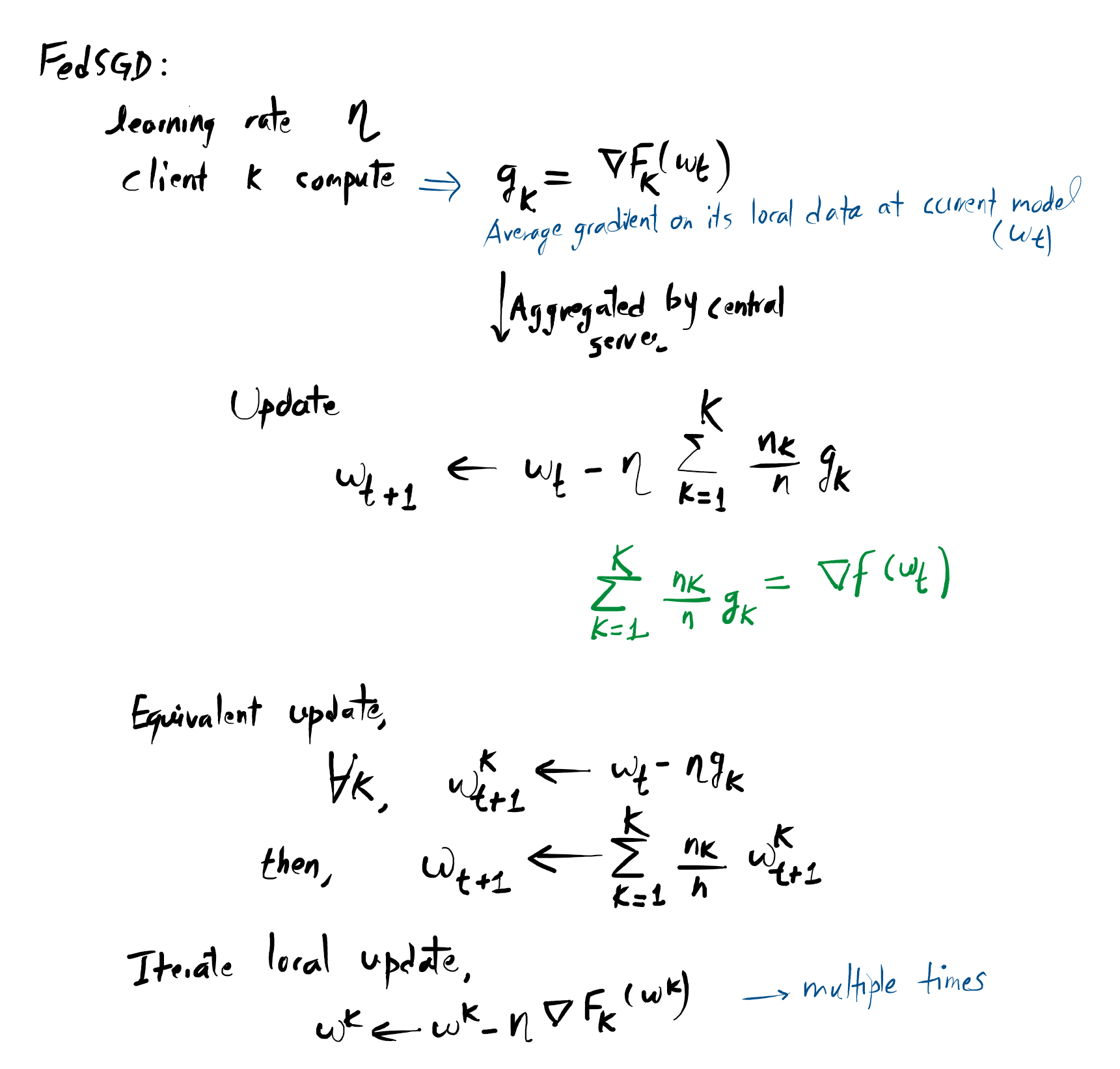 $w_{t+1} \leftarrow w_t – \eta \sum \frac{n_k}{n} g_k$