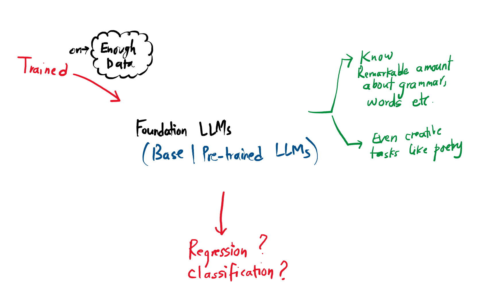 A Foundation LLM (or base/pre-trained model) is a general-purpose model trained on vast amounts of data. It understands grammar and can perform creative tasks like writing poetry. However, to solve specific problems (like classification or regression), it often serves as a starting platform rather than a finished solution.