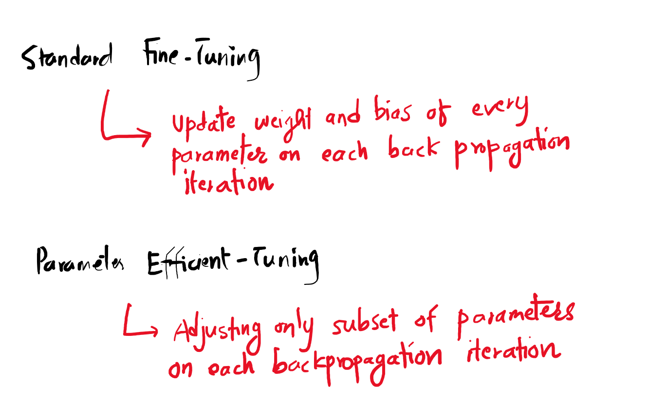 However, it is computationaly hard to fine tune whole foundation model i.e. all parameters and weights on each backpropagation. Thus, standard fine tuning has alternative which is parameter efficient tuning which adjusts only a subset of parameters on each backpropagation iteration.