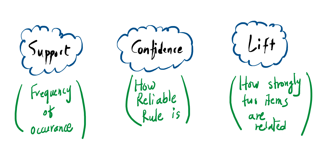 Not every pattern found in data is useful. To determine which rules are worth keeping, we use three primary mathematical metrics:
