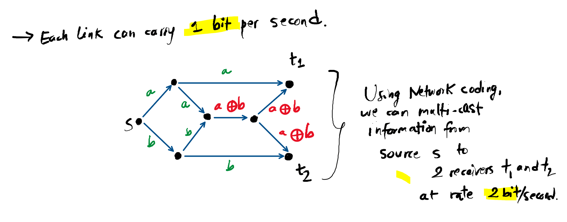 A network encoding can achieve the multicast capcity. This is not possible with routing. Suppose a link in the below graph figure can carry one bit per second. With Network encoding, we can multicast information from source node to destination or receiver nodes t1 and t2 at the rate of 2 bit/second.