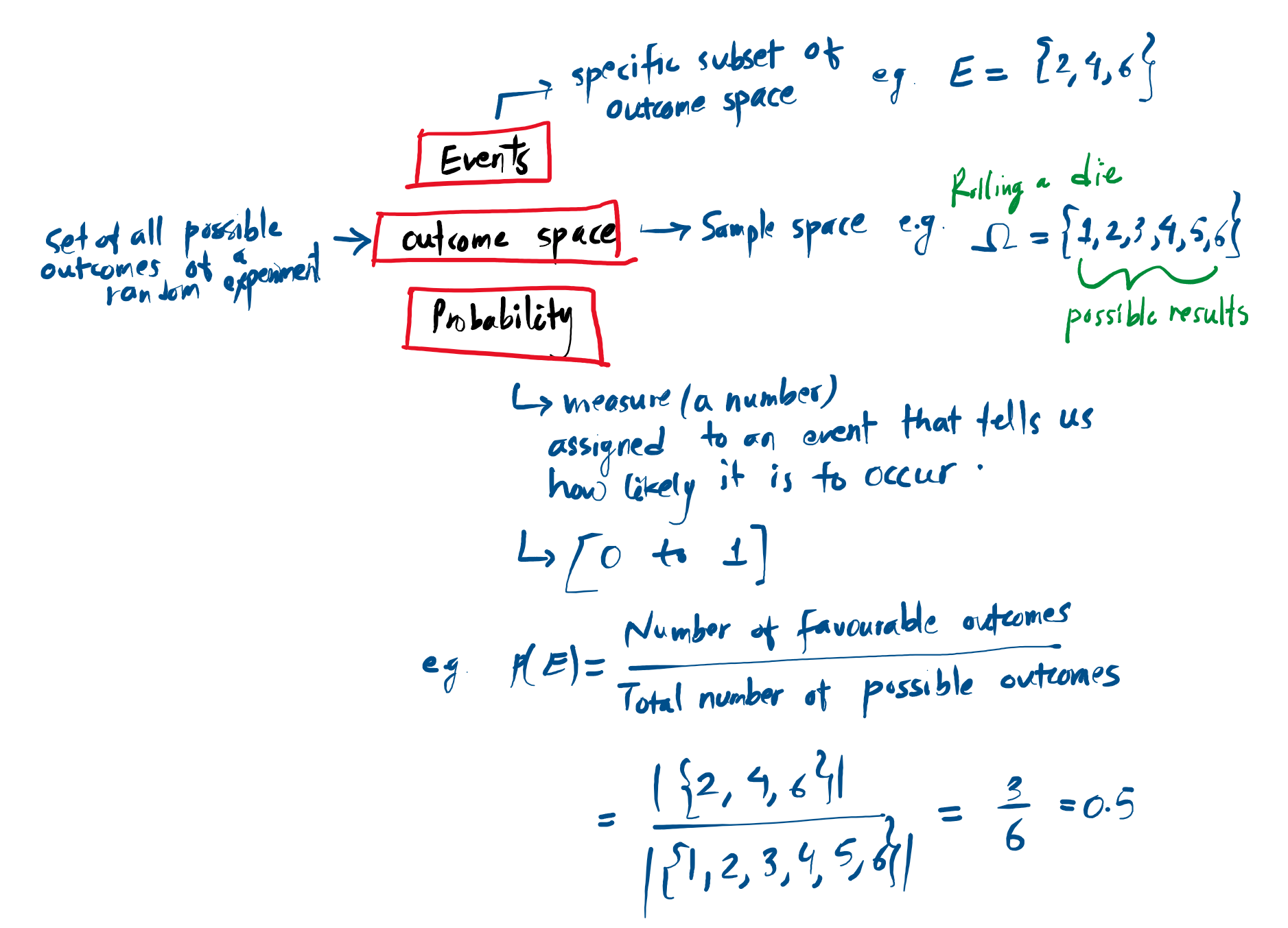 - Formula: For an experiment where all outcomes are equally likely (like a fair die), the probability of an event E is the size of the event subset divided by the size of the total outcome space: $P(E)=\frac{Number of favorable outcomes}{Total number of possible outcomes}$