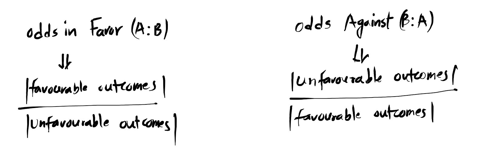 - Odds in Favor (A:B): Comparing the chances of the event happening vs. not happening. Odds in Favor = Number of Favorable Outcomes : Number of Unfavorable Outcomes