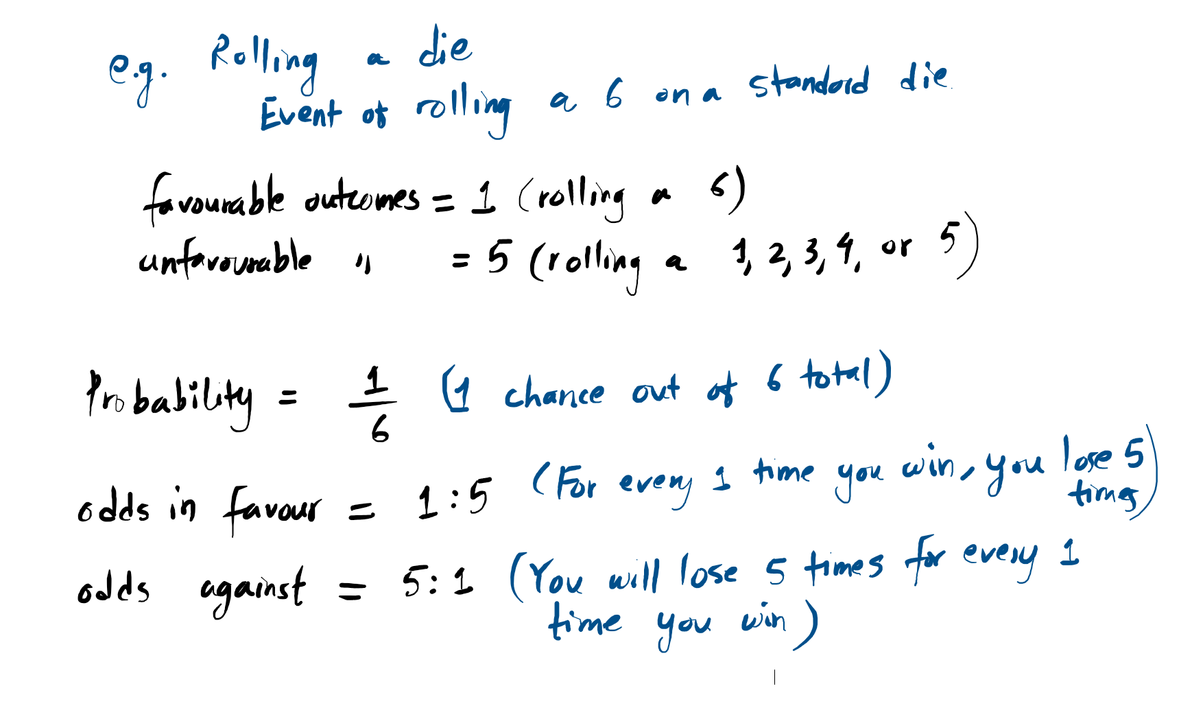 Example of odds: Let’s look at the event of rolling a 6 on a standard die.