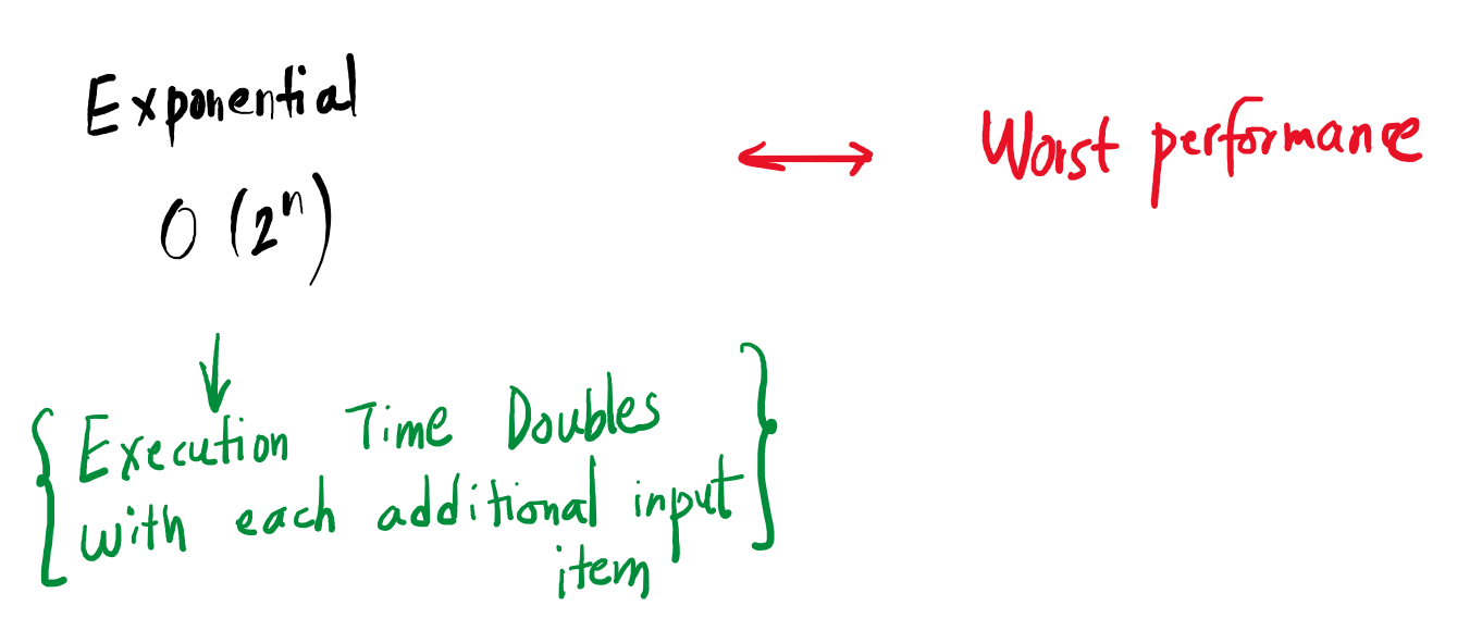 Exponential: The most aggressive growth, where doubling the input size can make a task impossible to solve in a reasonable timeframe.