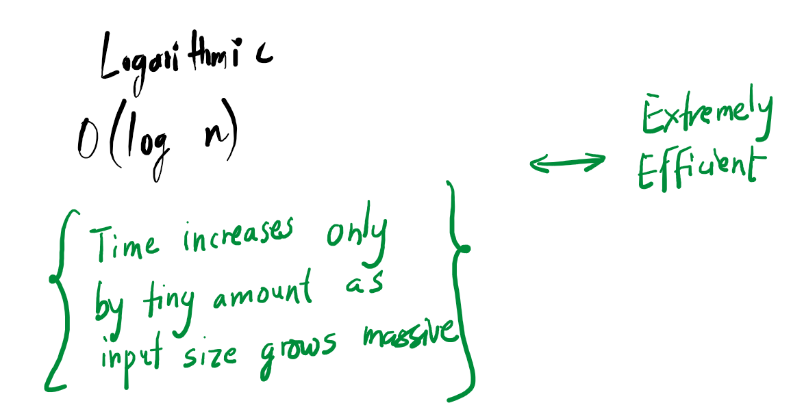 Logarithmic: Extremely efficient growth where processing time barely increases even as the data size grows significantly.